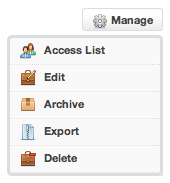 In the project list screen (which you access from the "Projects" list in the dashboard sidebar) you can see a list of your current projects. Next to each of these projects is a manage button which expands when clicked to include the options below: